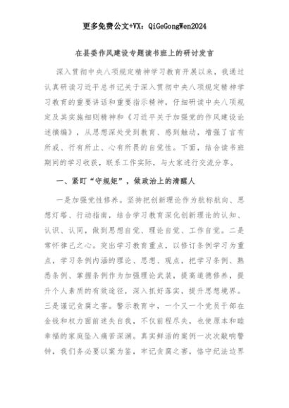 【七哥公文】2025年:在县委作风建设专题读书班上的研讨发言+更多免费公文+VX:QiGeGongWen2024+更多免费公文+VX:QiGeGongWen2024