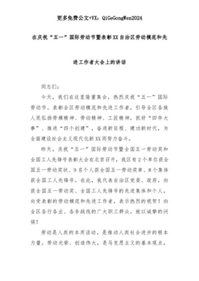 【七哥公文】2025年:在庆祝“五一”国际劳动节暨表彰XX自治区劳动模范和先进工作者大会上的讲话+更多免费公文+VX:QiGeGongWen2024+更多免费公文+VX:QiGeGongWen2024