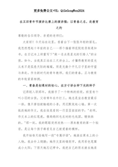 【七哥公文】2025年:在五四青年节演讲比赛上的演讲稿:以青春之名,赴教育之约+更多免费公文+VX:QiGeGongWen2024+更多免费公文+VX:QiGeGongWen2024