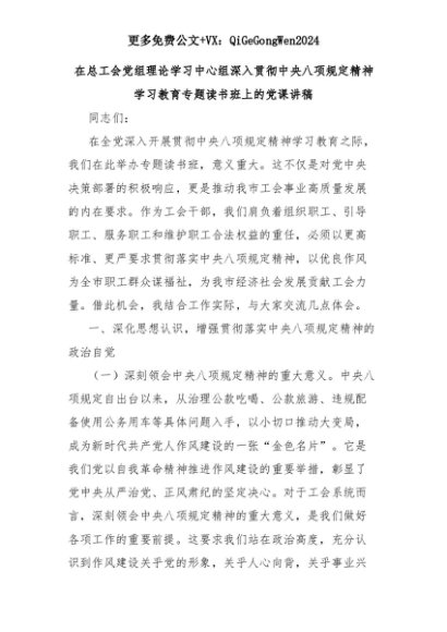 【七哥公文】2025年:在总工会党组理论学习中心组深入贯彻中央八项规定精神学习教育专题读书班上的党课讲稿+更多免费公文+VX:QiGeGongWen2024+更多免费公文+VX:QiGeGongWen2024