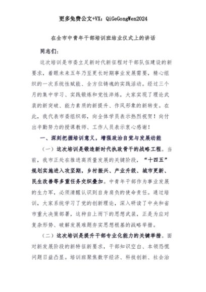 【七哥公文】2025年:在全市中青年干部培训班结业仪式上的讲话+更多免费公文+VX:QiGeGongWen2024+更多免费公文+VX:QiGeGongWen2024