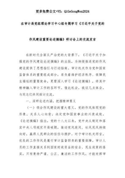 【七哥公文】2025年:在审计局党组理论学习中心组专题学习《习近平关于党的作风建设重要论述摘编》研讨会上的交流发言+更多免费公文+VX:QiGeGongWen2024+更多免费公文+VX:QiGeGongWen2024
