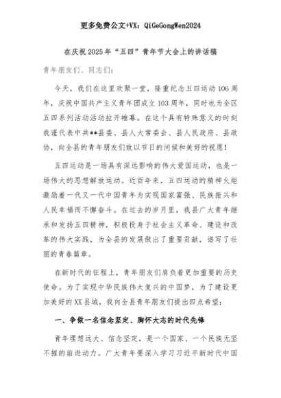 【七哥公文】2025年:在庆祝2025年“五四”青年节大会上的讲话稿+更多免费公文+VX:QiGeGongWen2024+更多免费公文+VX:QiGeGongWen2024