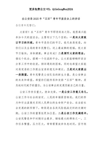 【七哥公文】2025年:在公安局2025年“五四”青年节座谈会上的讲话+更多免费公文+VX:QiGeGongWen2024+更多免费公文+VX:QiGeGongWen2024