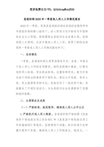 【七哥公文】2025年:县组织部2025年一季度选人用人工作情况报告+更多免费公文+VX:QiGeGongWen2024+更多免费公文+VX:QiGeGongWen2024