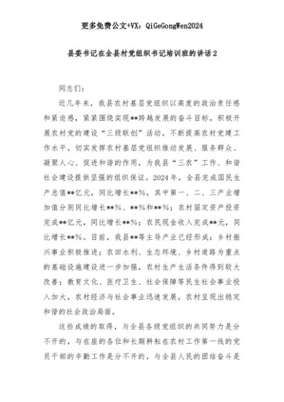 【七哥公文】2025年:县委书记在全县村党组织书记培训班的讲话2+更多免费公文+VX:QiGeGongWen2024+更多免费公文+VX:QiGeGongWen2024