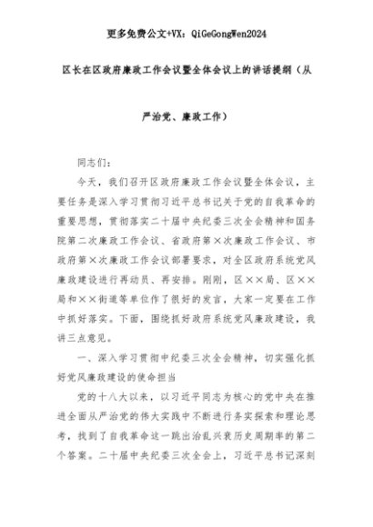 【七哥公文】2025年:区长在区政府廉政工作会议暨全体会议上的讲话提纲(从严治党、廉政工作)+更多免费公文+VX:QiGeGongWen2024+更多免费公文+VX:QiGeGongWen2024