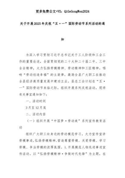 【七哥公文】2025年:关于开展2025年庆祝“五·一”国际劳动节系列活动的通知+更多免费公文+VX:QiGeGongWen2024+更多免费公文+VX:QiGeGongWen2024