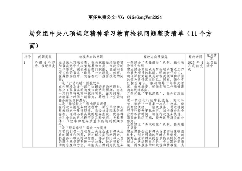 【七哥公文】2025年:八项规定精神学习教育检视问题整改清单(班子11个方面)+更多免费公文+VX:QiGeGongWen2024+更多免费公文+VX:QiGeGongWen2024
