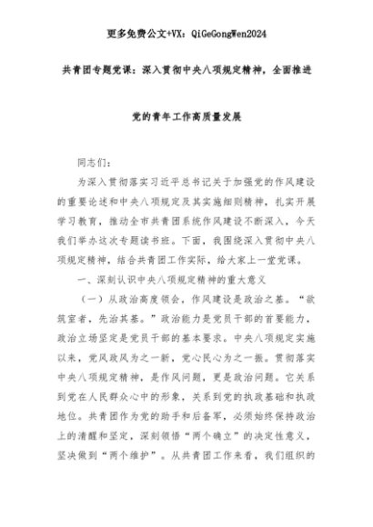 【七哥公文】2025年:共青团专题党课:深入贯彻中央八项规定精神,全面推进党的青年工作高质量发展+更多免费公文+VX:QiGeGongWen2024+更多免费公文+VX:QiGeGongWen2024