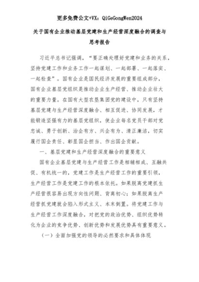 【七哥公文】2025年:关于国有企业推动基层党建和生产经营深度融合的调查与思考报告+更多免费公文+VX:QiGeGongWen2024+更多免费公文+VX:QiGeGongWen2024