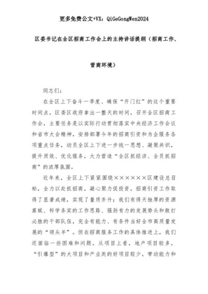 【七哥公文】2025年:区委书记在全区招商工作会上的主持讲话提纲(招商工作、营商环境)+更多免费公文+VX:QiGeGongWen2024+更多免费公文+VX:QiGeGongWen2024