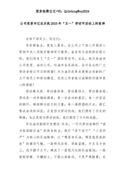 【七哥公文】2025年:公司党委书记在庆祝2025年“五一”劳动节活动上的致辞+更多免费公文+VX:QiGeGongWen2024+更多免费公文+VX:QiGeGongWen2024