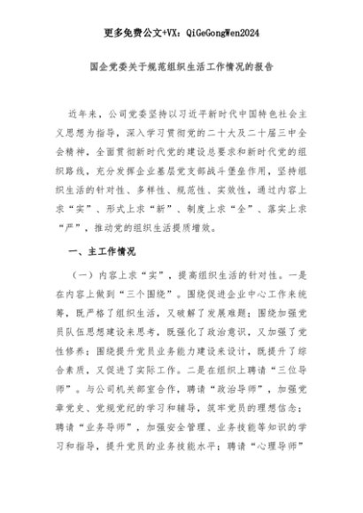 【七哥公文】2025年:国企党委关于规范组织生活工作情况的报告+更多免费公文+VX:QiGeGongWen2024+更多免费公文+VX:QiGeGongWen2024