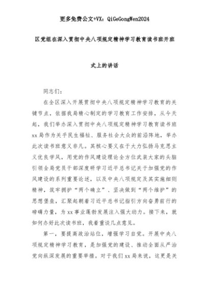 【七哥公文】2025年:区党组在深入贯彻中央八项规定精神学习教育读书班开班式上的讲话+更多免费公文+VX:QiGeGongWen2024+更多免费公文+VX:QiGeGongWen2024
