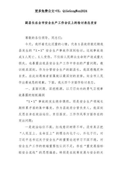 【七哥公文】2025年:副县长在全市安全生产工作会议上的检讨表态发言+更多免费公文+VX:QiGeGongWen2024+更多免费公文+VX:QiGeGongWen2024