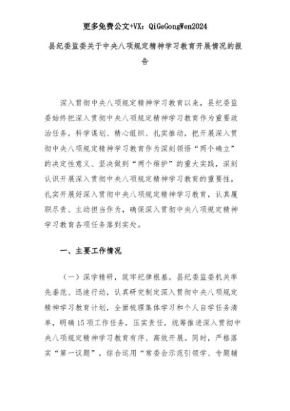 【七哥公文】2025年:县纪委监委关于中央八项规定精神学习教育开展情况的报告+更多免费公文+VX:QiGeGongWen2024+更多免费公文+VX:QiGeGongWen2024