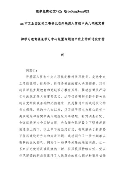 【七哥公文】2025年:xx市工业园区党工委书记在开展深入贯彻中央八项规定精神学习教育理论学习中心组暨专题读书班上的研讨发言+更多免费公文+VX:QiGeGongWen2024+更多免费公文+VX:QiGeGongWen2024