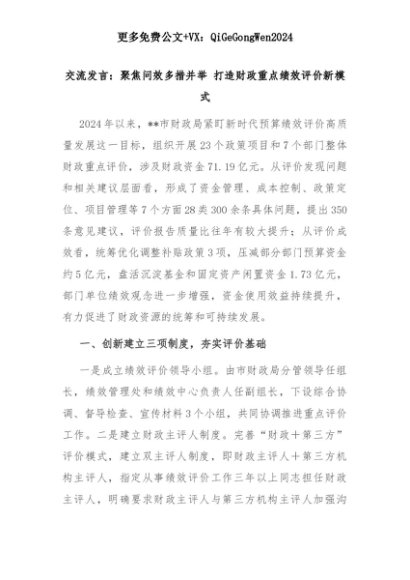 【七哥公文】2025年:交流发言:聚焦问效多措并举 打造财政重点绩效评价新模式+更多免费公文+VX:QiGeGongWen2024+更多免费公文+VX:QiGeGongWen2024