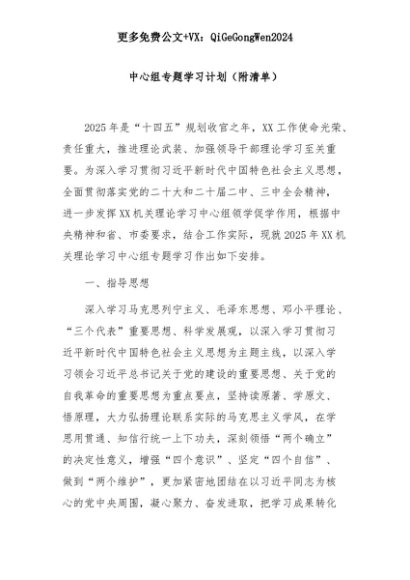 【七哥公文】2025年:中心组专题学习计划(附清单)+更多免费公文+VX:QiGeGongWen2024+更多免费公文+VX:QiGeGongWen2024