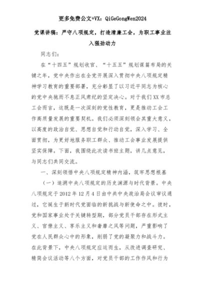 【七哥公文】2025年:党课讲稿:严守八项规定,打造清廉工会,为职工事业注入强劲动力+更多免费公文+VX:QiGeGongWen2024+更多免费公文+VX:QiGeGongWen2024