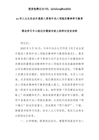 【七哥公文】2025年:xx市人大主任在开展深入贯彻中央八项规定精神学习教育理论学习中心组记专题读书班上的研讨发言材料+更多免费公文+VX:QiGeGongWen2024+更多免费公文+VX:QiGeGongWen2024