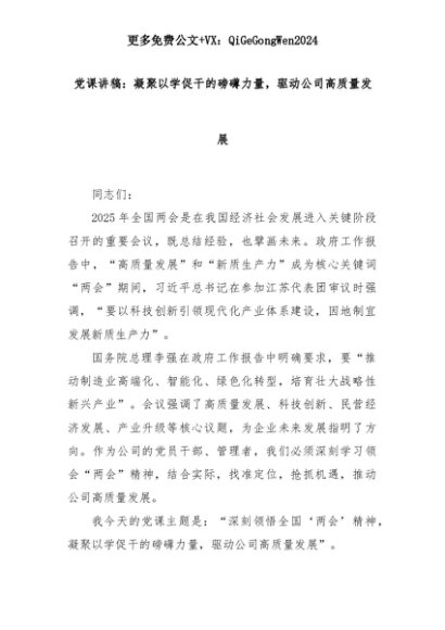 【七哥公文】2025年:党课讲稿:凝聚以学促干的磅礴力量,驱动公司高质量发展+更多免费公文+VX:QiGeGongWen2024+更多免费公文+VX:QiGeGongWen2024