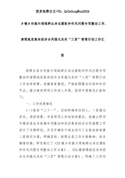 【七哥公文】2025年:乡镇乡村振兴领域群众身边腐败和作风问题专项整治工作、清理规范集体经济合同强化农村“三资”管理行动工作汇报+更多免费公文+VX:QiGeGongWen2024+更多免费公文+VX:QiGeGongWen2024