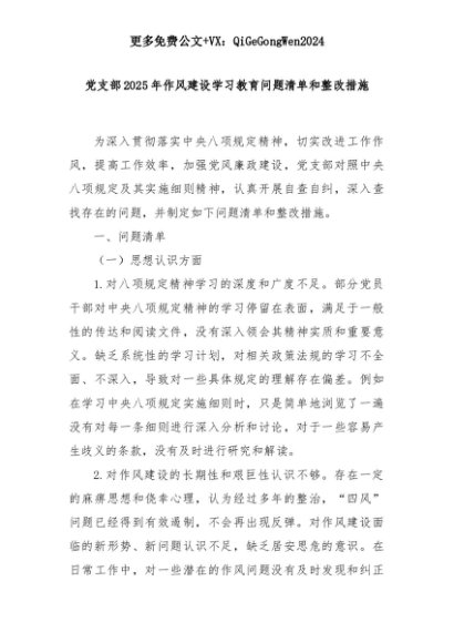 【七哥公文】2025年:党支部2025年作风建设学习教育问题清单和整改措施+更多免费公文+VX:QiGeGongWen2024+更多免费公文+VX:QiGeGongWen2024
