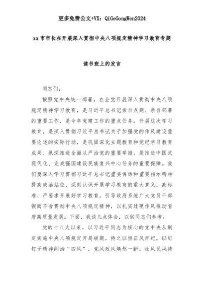 【七哥公文】2025年:xx市市长在开展深入贯彻中央八项规定精神学习教育专题读书班上的发言+更多免费公文+VX:QiGeGongWen2024+更多免费公文+VX:QiGeGongWen2024