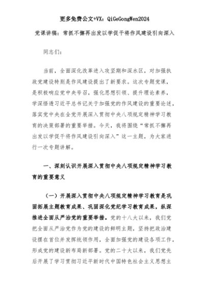 【七哥公文】2025年:党课讲稿:常抓不懈再出发以学促干将作风建设引向深入+更多免费公文+VX:QiGeGongWen2024+更多免费公文+VX:QiGeGongWen2024