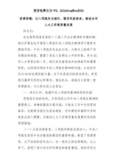 【七哥公文】2025年:党课讲稿:以八项规定为指引,强作风担使命,推动全市人大工作高质量发展+更多免费公文+VX:QiGeGongWen2024+更多免费公文+VX:QiGeGongWen2024
