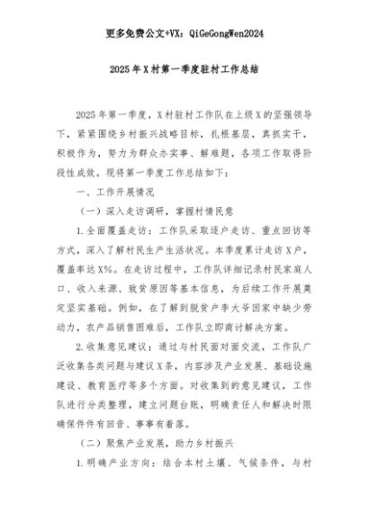 【七哥公文】2025年:2025年X村第一季度驻村工作总结+更多免费公文+VX:QiGeGongWen2024+更多免费公文+VX:QiGeGongWen2024