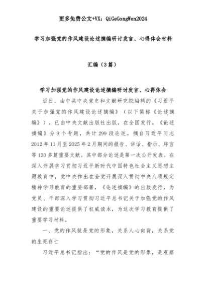 【七哥公文】2025年:(3篇)学习加强党的作风建设论述摘编研讨发言、心得体会材料汇编+更多免费公文+VX:QiGeGongWen2024+更多免费公文+VX:QiGeGongWen2024