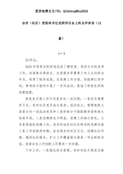 【七哥公文】2025年:(12篇)在村(社区)党组织书记述职评议会上的点评讲话+更多免费公文+VX:QiGeGongWen2024+更多免费公文+VX:QiGeGongWen2024