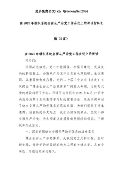 【七哥公文】2025年:(5篇)在2025年组织系统全面从严治党工作会议上的讲话材料汇编+更多免费公文+VX:QiGeGongWen2024+更多免费公文+VX:QiGeGongWen2024