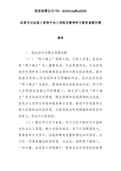【七哥公文】2025年:纪委书记在深入贯彻中央八项规定精神学习教育查摆问题清单+更多免费公文+VX:QiGeGongWen2024+更多免费公文+VX:QiGeGongWen2024