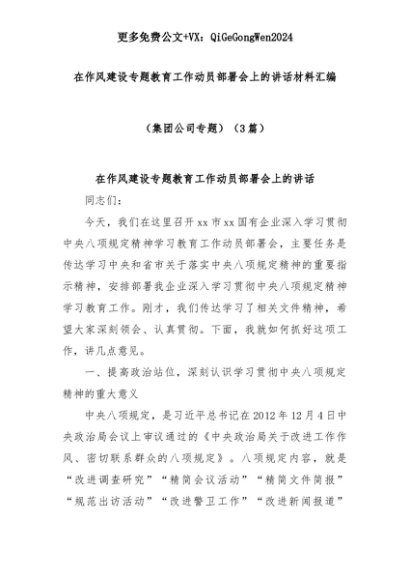 【七哥公文】2025年:(3篇)在作风建设专题教育工作动员部署会上的讲话材料汇编(集团公司专题)+更多免费公文+VX:QiGeGongWen2024+更多免费公文+VX:QiGeGongWen2024