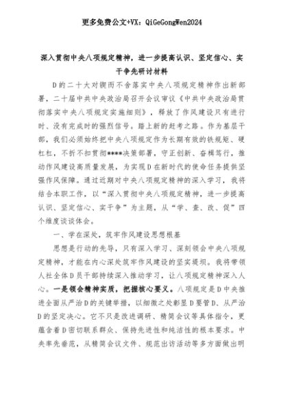 【七哥公文】2025年:深入贯彻中央八项规定精神,进一步提高认识、坚定信心、实干争先研讨材料+更多免费公文+VX:QiGeGongWen2024+更多免费公文+VX:QiGeGongWen2024