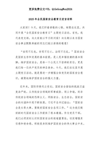 【七哥公文】2025年:2025年全民国家安全教育日发言材料+更多免费公文+VX:QiGeGongWen2024+更多免费公文+VX:QiGeGongWen2024
