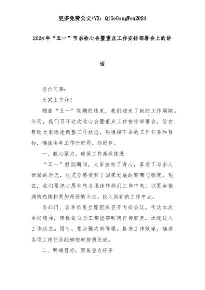 【七哥公文】2025年:2024年“五一”节后收心会暨重点工作安排部署会上的讲话+更多免费公文+VX:QiGeGongWen2024+更多免费公文+VX:QiGeGongWen2024