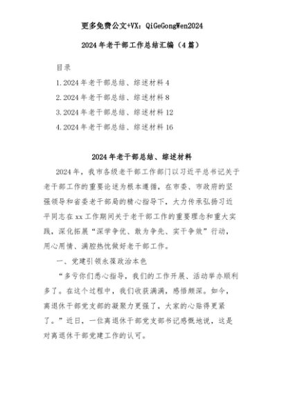 【七哥公文】2025年:(4篇)2024年老干部工作总结汇编+更多免费公文+VX:QiGeGongWen2024+更多免费公文+VX:QiGeGongWen2024