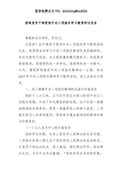 【七哥公文】2025年:普通党员干部贯彻中央八项规定学习教育研讨发言+更多免费公文+VX:QiGeGongWen2024+更多免费公文+VX:QiGeGongWen2024