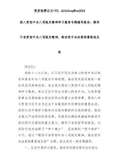 【七哥公文】2025年:深入贯彻中央八项规定精神学习教育专题辅导报告:锲而不舍贯彻中央八项规定精神,推动党中央决策部署落地见效+更多免费公文+VX:QiGeGongWen2024+更多免费公文+VX:QiGeGongWen2024