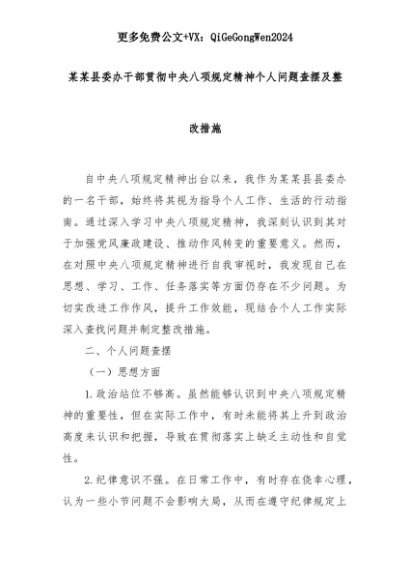 【七哥公文】2025年:某某县委办干部贯彻中央八项规定精神个人问题查摆及整改措施+更多免费公文+VX:QiGeGongWen2024+更多免费公文+VX:QiGeGongWen2024
