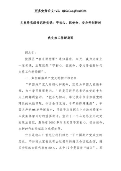 【七哥公文】2025年:文旅局党组书记讲党课:守初心,担使命,奋力开创新时代文旅工作新局面+更多免费公文+VX:QiGeGongWen2024+更多免费公文+VX:QiGeGongWen2024