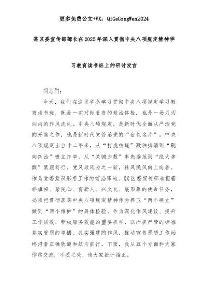 【七哥公文】2025年:某区委宣传部部长在2025年深入贯彻中央八项规定精神学习教育读书班上的研讨发言+更多免费公文+VX:QiGeGongWen2024+更多免费公文+VX:QiGeGongWen2024
