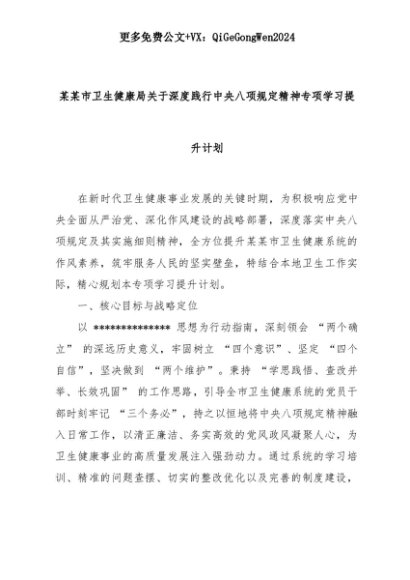 【七哥公文】2025年:某某市卫生健康局关于深度践行中央八项规定精神专项学习提升计划+更多免费公文+VX:QiGeGongWen2024+更多免费公文+VX:QiGeGongWen2024