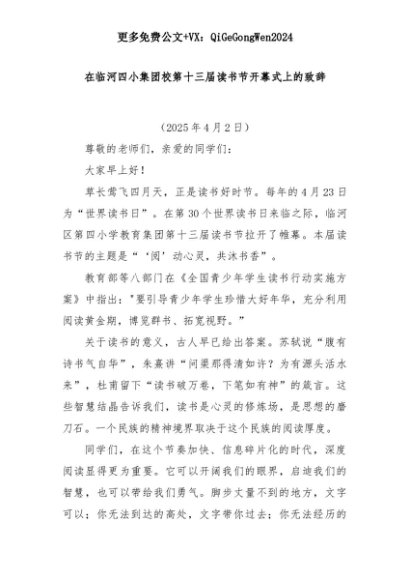 【七哥公文】2025年:在临河四小集团校第十三届读书节开幕式上的致辞+更多免费公文+VX:QiGeGongWen2024+更多免费公文+VX:QiGeGongWen2024