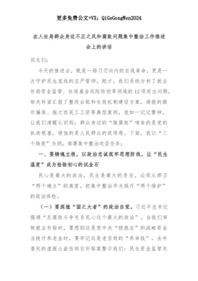 【七哥公文】2025年:在人社局群众身边不正之风和腐败问题集中整治工作推进会上的讲话+更多免费公文+VX:QiGeGongWen2024+更多免费公文+VX:QiGeGongWen2024